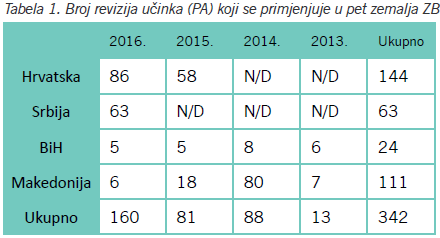 Tabela 1. Broj revizija učinka (PA) koji se primjenjuje u pet zemalja ZB