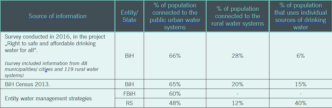 According to the survey from 2016[1], more than one third of BiH citizens is not connected to the public water supply systems: 28% of citizens use water from the rural water supply systems, 6% of citizens rely on individual water sources (usually wells), while the remaining 66% of citizens use drinking water from the public water supply systems (Table 1).