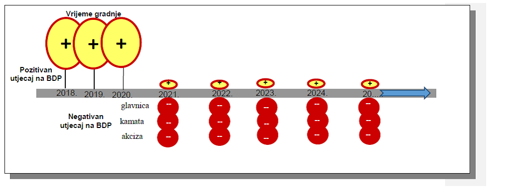 Iz prethodno navedenog jasno se vidi da akcize i novi krediti mogu utjecati pozitivno ukoliko gradnja autocesta i cesta uzrokuje dugoročni ekonomski rast koji će izdržati pritisak anuiteta/ráta, kamata i akciza u budućnosti. Ukoliko to nije slučaj, onda kopamo rupu u kojoj se nalazimo. Na žalost veličina krugova u prikazanom dijagramu nije poznata i samim tim ni konačni utjecaj.