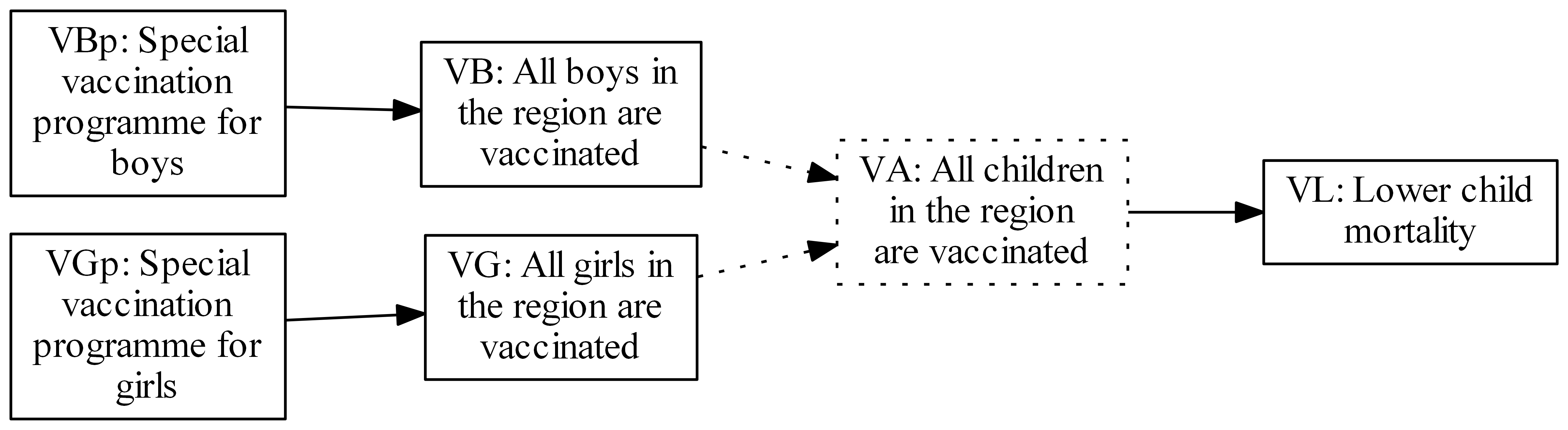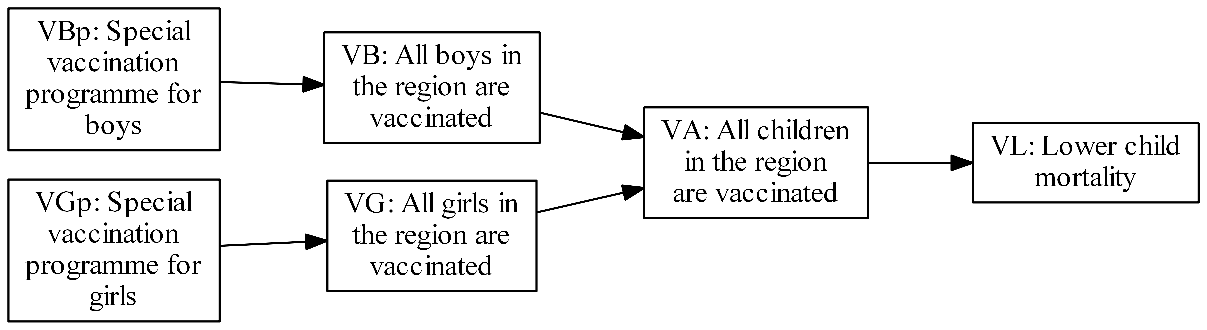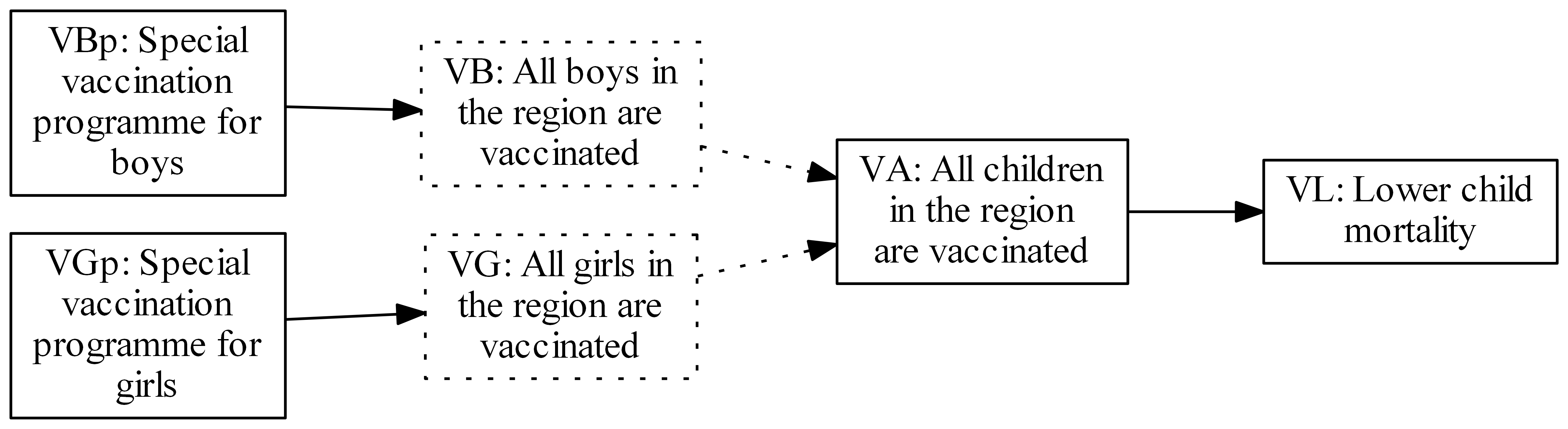 Most manuals forbid this as nonsense because links like these are not in fact causal. The reason we nevertheless often see this kind of configuration is because it is useful nonsense. For example the project is paid for VA, not for VB or VG. A variable like VA can summarise multiple small achievements into something which is significant when we take “a higher-level perspective”, for example that of a donor. Or perhaps we only have evidence about gender-specific vaccinations on the one hand (VBp to VB, VGp to VG) and about the effect of VA on VL on the other, so we are not quite justified in drawing arrows directly from VBp and VGp directly to VL[1].