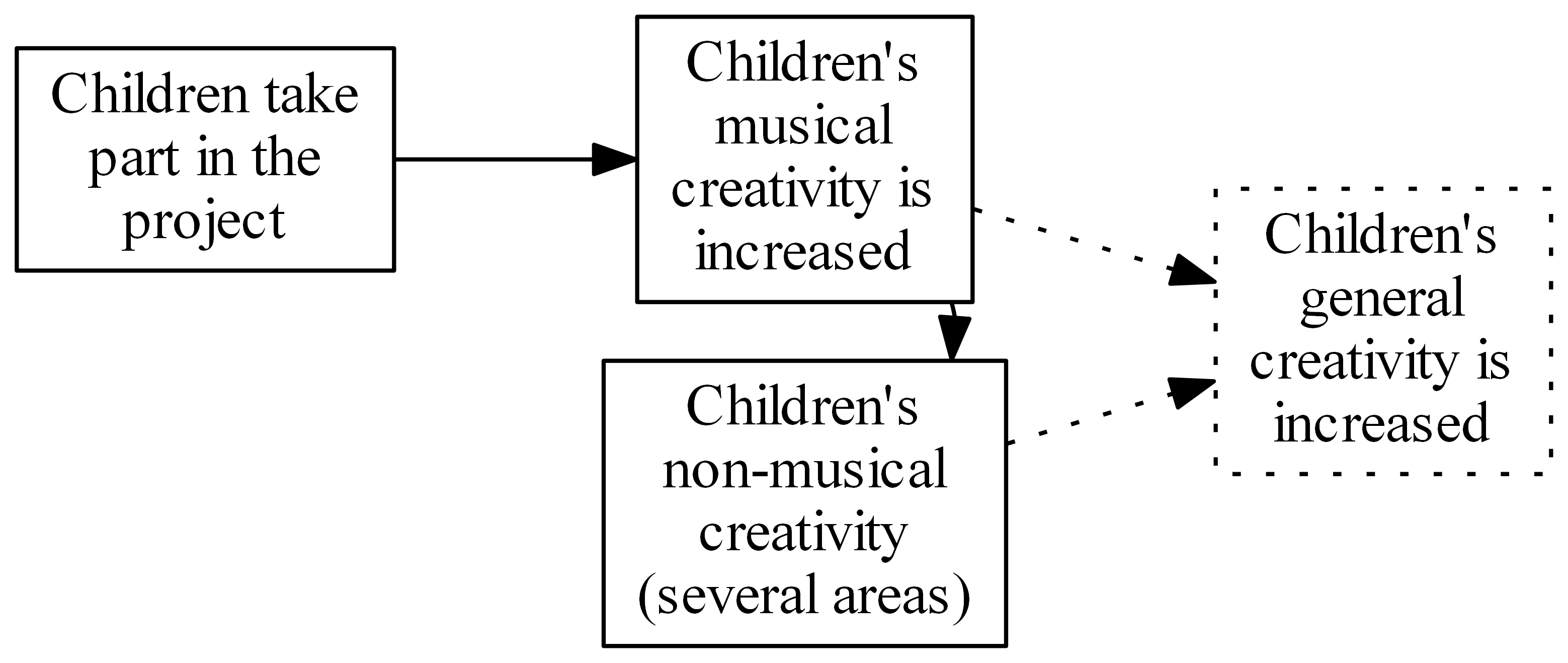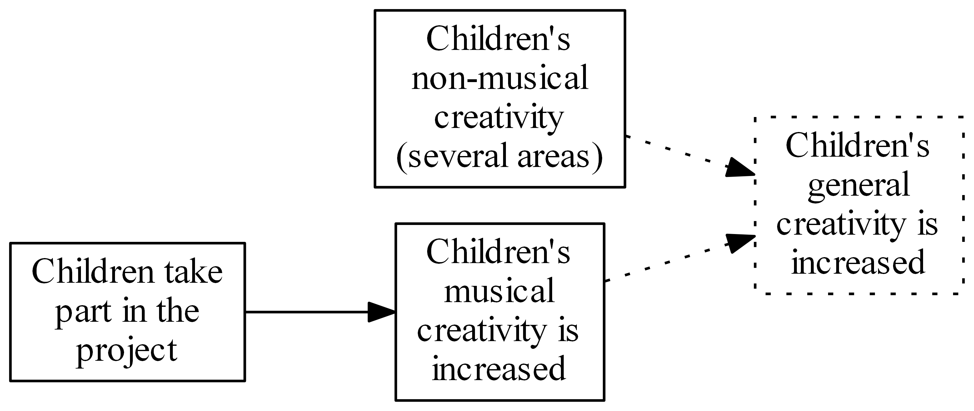 Very frequently, this kind of project also tries to influence the rest of the “higher-level” outcome too, which would seem to result in a link which is both causal and definitional at the same time: not a good idea. Instead, we can show a link from musical creativity to the other part(s) of the definition, like this: