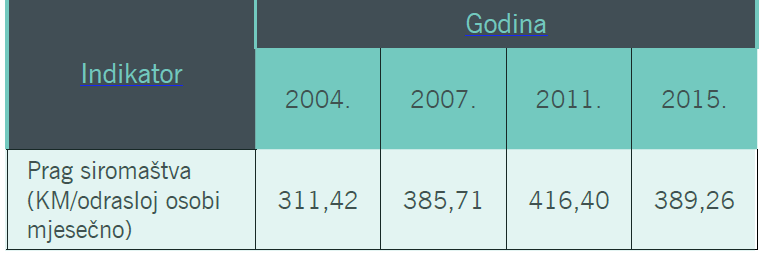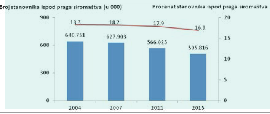 U Bosni i Hercegovini je u periodu od 2004. do 2015. godine prisutan pad broja siromašnih stanovnika i blago smanjenje rizika od siromaštva. Jedan od uzroka smanjenja broja siromašnih bilo je i smanjenje broja stanovnika u BiH u tom periodu. Indeks jaza siromaštva i indikatori nejednakosti jasno ukazuju na prilično jaku rezistentnost siromaštva. To govori da su mjere za smanjenje siromaštva prilično neefikasne i pogrešno usmjerene (Šabanović, 2016).